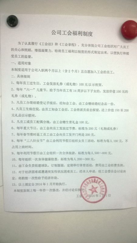 广东山之风材料科技有限公司在2013年10月15日成立了工会,致力于打造员工与公司沟通的平台,为广大员工谋利益,近日发布了《公司工会福利制度》。购物卡、生日礼金、一天一苹果等等,福利多多,山之风的员工都是幸福的。