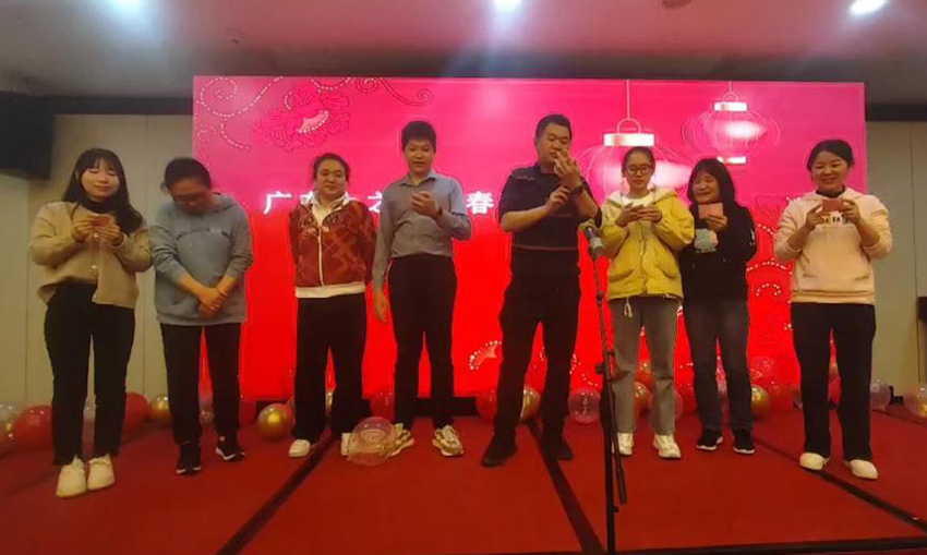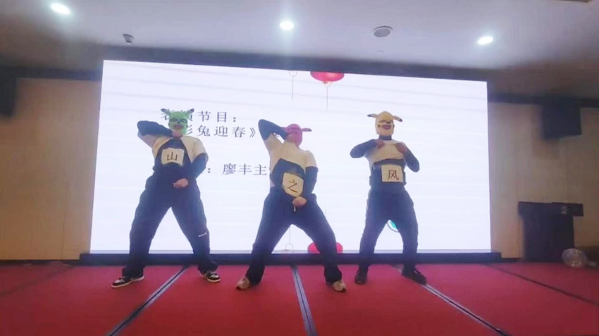 最后是由销售一部廖丰主管组带来的压轴表演。压轴节目可以说是很用心准备了,不仅动作和道具都很到位,取的节目名称也是十分的喜庆--《彩兔迎春》,与我们今年年会的主题十分贴近。