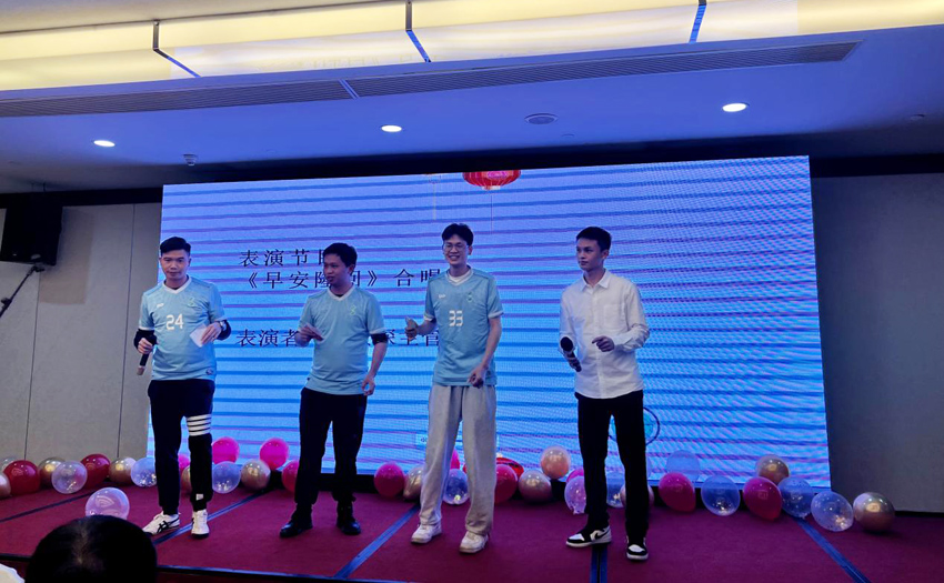不服输的销售一部陈景探主管随后也带领组员为大家表演了合唱歌曲,世界杯神曲--《早安隆回》,歌曲演唱得热血沸腾,将全场的气氛都调动了起来。不仅如此,他们还邀请了各位同事作为助演嘉宾,大家又唱又跳,其乐无穷,从他们的笑容中就可以感受到大家当时的快乐。