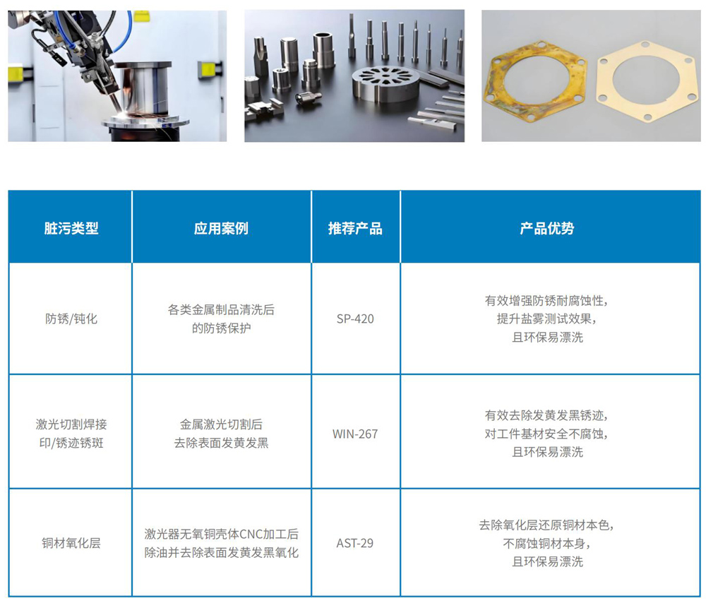 山之风清洗剂广泛应用于3C消费电子、航天航空、汽车零部件、医疗器械等领域的金属部件,产品方案涵盖冲压、车铣、CNC加工、研磨、喷砂、抛光、阳极氧化、PVD镀膜等全制程工序前后清洗表面处理。 按不同脏污类型⸺切削液/油、锆粉、抛光蜡、氧化铝/氧化硅抛光液、油墨、胶、油漆、膜层、氧化层等,应用于铝材、钢材、铜材、钛合金等各类材质,山之风公司均可提供相应方案产品及配套工艺经验。