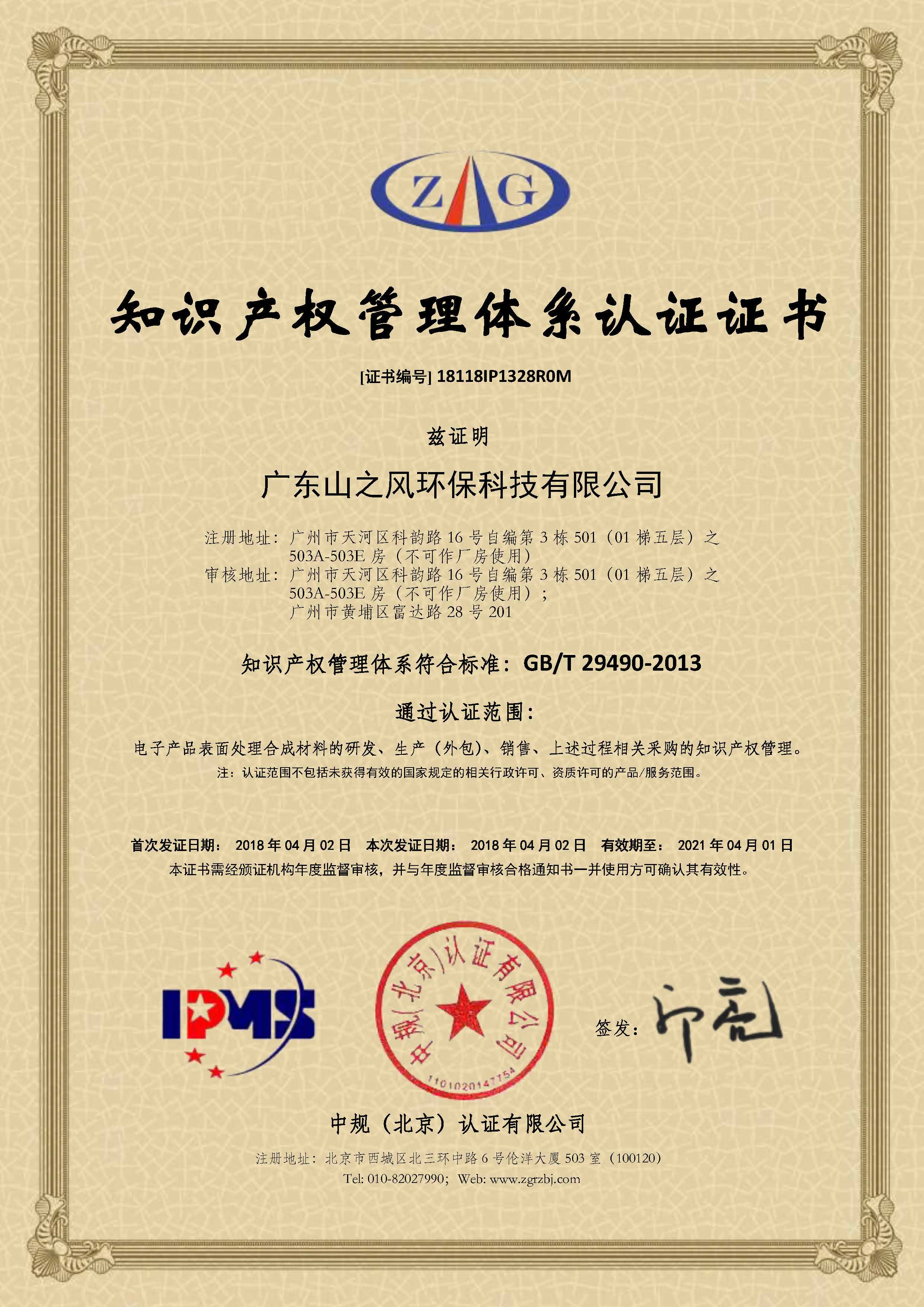 2018年4月3日,广东山之风材料科技有限公司凭借其规范完善的知识产权管理体系,喜获国家《知识产权管理体系认证证书》,标志着广东山之风在知识产权规范化管理、运用及风险防范等方面迈上新台阶。
