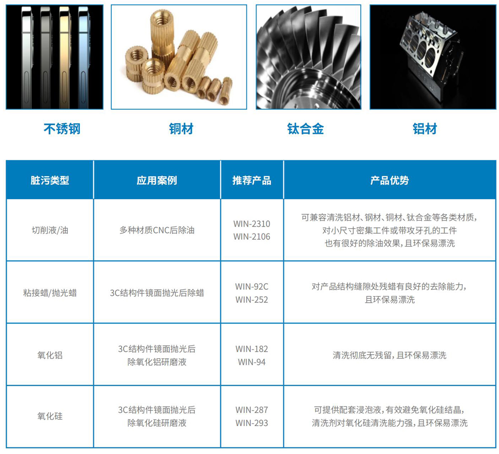 山之风清洗剂广泛应用于3C消费电子、航天航空、汽车零部件、医疗器械等领域的金属部件,产品方案涵盖冲压、车铣、CNC加工、研磨、喷砂、抛光、阳极氧化、PVD镀膜等全制程工序前后清洗表面处理。 按不同脏污类型⸺切削液/油、锆粉、抛光蜡、氧化铝/氧化硅抛光液、油墨、胶、油漆、膜层、氧化层等,应用于铝材、钢材、铜材、钛合金等各类材质,山之风公司均可提供相应方案产品及配套工艺经验。